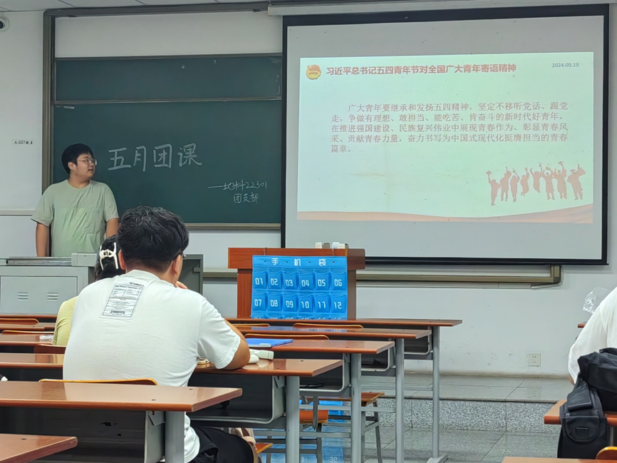 陈一鸣先向大家对本次团会的开展形式和团会议程进行介绍,明确了团会的主题和意义。然后,他为同学们讲解了“弘扬五四精神,勇担时代重任”系列主题教育学习资料,让同学们意识到了当代青年所肩负的任务和使命,只有继承和发扬五四精神,争做有理想、敢担当、能吃苦、肯奋斗的新时代好青年,才能在复兴民族伟业中有所作为、书写为中国式现代化挺膺担当的青春篇章。接下来,陈一鸣讲解了《中国共产党纪律处分条例》的主要内容,让同学们更加深入的学习党的纪律和要求。随后,团支书陈一鸣带领支部全体成员学习了《湖北省宗教事务条例》和《中国共产主义青年团章程》,强调了“团员不能信仰宗教”这一原则。之后,陈一鸣带领同学们进行“理论知识我来学“的专题学习,通过播放相关视频、讲解最美劳动个人事迹进行了劳动思想教育,引导同学们深入领会并认识到劳动在个人成长道路上的重要作用,以及劳动对于推动社会发展的不可或缺的价值。最后,同学们共同完成了“青年大学习”网上主题团课。