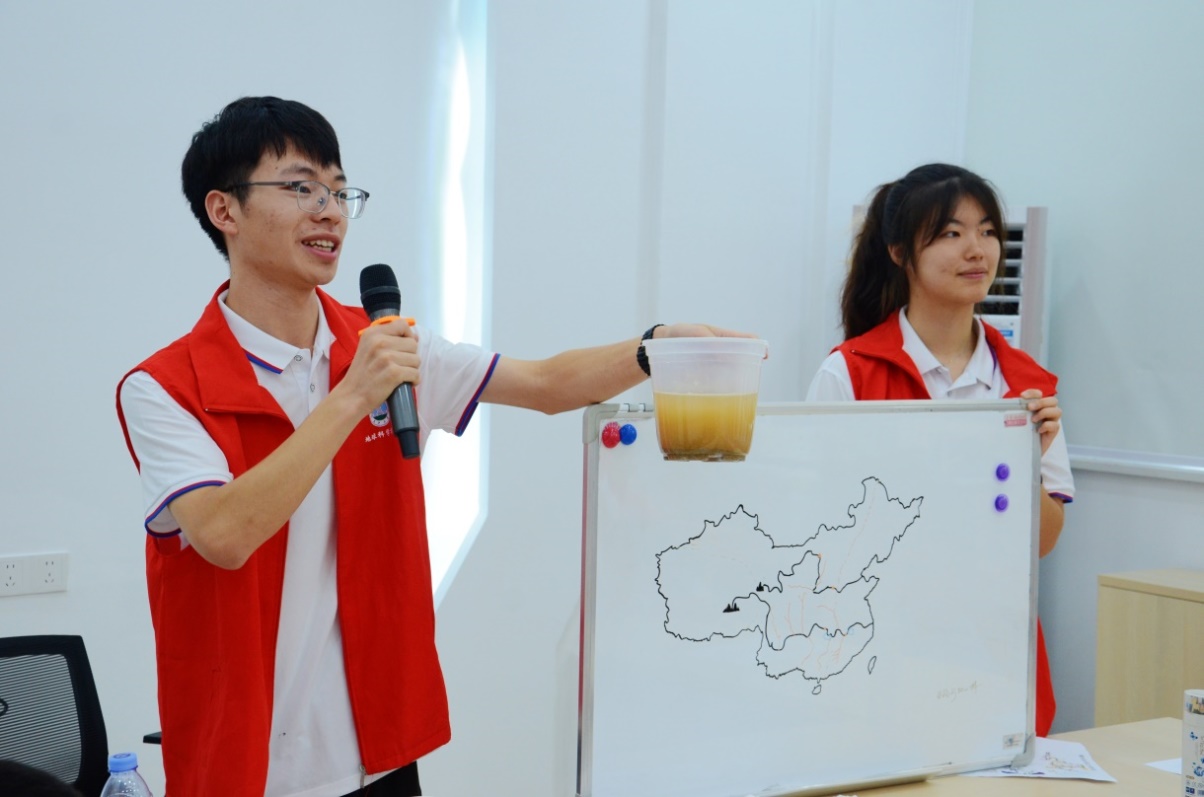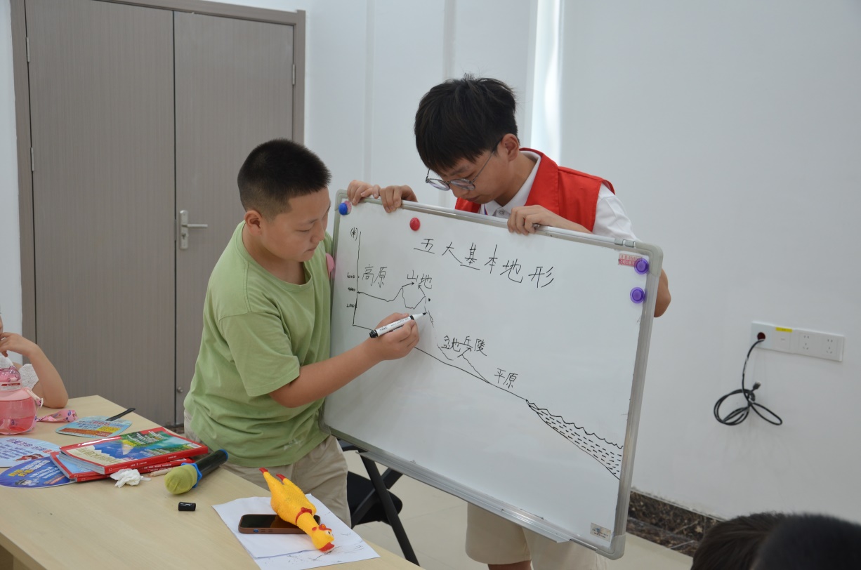 如何将枯燥的地学知识讲得生动有趣,实践队志愿者们可花了不少心思。11名实践队员集体备课,挑选孩子们感兴趣且与生活贴近的知识点,提前准备教学道具和实验用品,还精心设计教学内容和环节,力求达到寓教于乐的目的。第一场基本地形科普课上,实践队员戴佩为孩子们讲授完知识点后,马上邀请几个不同身高的孩子上台,分别扮演高原、平原、山地、丘陵和盆地,孩子们在形象有趣的游戏中,一下子就将五大基本地形深深地记在脑子里。“老师们讲的太有趣啦,让我轻松理解了这些地理知识,真的还想再多上几节地质科普课!”初一年级的学生张宇轩激动地说。