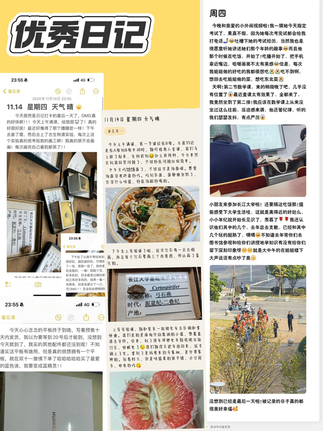 “路上,看到了特别美的日落”,“只要有心就可以跨越万难”,“图书馆四楼靠窗的风景,不就是一幅山水画嘛”,“听歌是一件很幸福很放松的事”,“今天有一个化石着实让我感到意外”,“每个知识点都像一个点亮的小灯泡,在我的脑海里闪烁,让我感觉收获颇丰,下课时,心里充满满足感”.......无论是他人的帮助、个人的成长,还是日常的美食、美景,亦或是课堂上的收获,充满生活气息的图片、渗透着温度的细腻文字、温馨瞬间......被同学们在感恩日记中一一捕捉。大家感恩生活中的每一份赠予,包括蓝天、白云、花草等大自然恩赐,以及遇到的困难和挑战,因为它们也是成长的一部分。