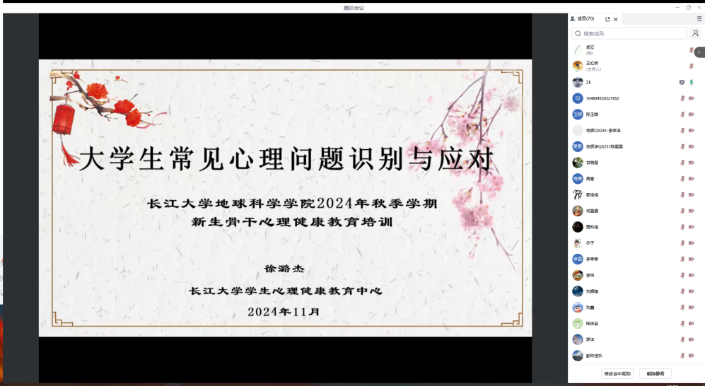 (通讯员 郭禹 审核 王红桥)2024年11月19日19:00,十大网投正规官网特邀心理健康中心徐潞杰老师主讲新生心理骨干教育培训,东校区135名本科生在12教104,武汉校区70名研究生心理骨干通过腾讯会议,共同参与学习。