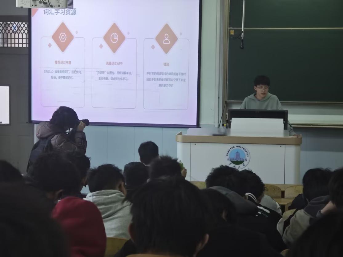 资工油光22201雷航以“逆风翻盘”为题,讲述自己如何在完全没有听力基础的情况下,通过反复练习真题录音,熟悉语速和口音,最终在四级考试中取得高分。资工(卓越)22301班的韩艾希分享自己在备考时会根据自身实际水平设定合理的目标分数,并在达成目标时给自己一个小奖励,以激励自己不断努力。资工12401班的卜文杰提醒同学们一定要加强单词背诵,自己经常使用“百词斩”,以图片、视频讲解单词,生动有趣,适合碎片化学习。地信12401班的王梓璇说:“改变拖延的习惯,我们的备战就成功了一半。”几位同学分享了自己的备考经验和学习方法。他们从词汇积累、听力训练、阅读理解、写作技巧等方面进行了详细的介绍,并建议同学们合理安排时间,制定科学的学习计划,多做真题,注重总结错题,不断提高自己的英语综合能力。
