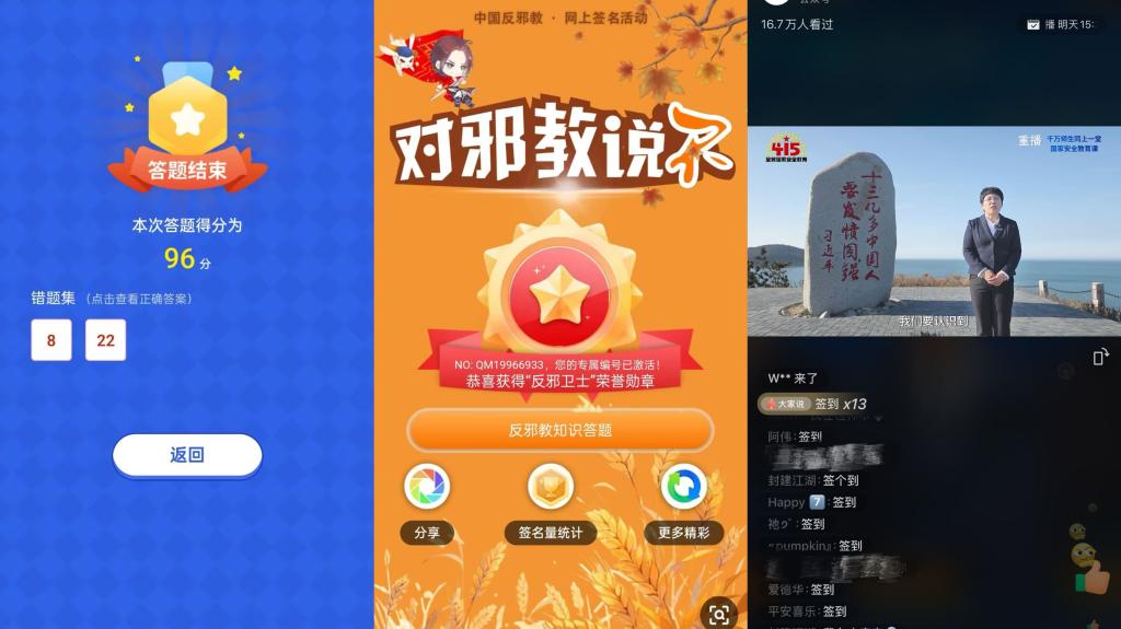 直播观看完毕后,十大网投正规官网各班纷纷开展了国家安全主题班会。在班会上,各年级辅导员、班主任老师与同学们一起观看了“反邪教警示教育进校园”视频。同学们围绕“日常生活中如何维护国家安全与防范邪教”展开讨论,并纷纷在“中国反邪教”公众号上进行网上签名,积极参与“全国大学生国家安全知识答题”活动,增强了同学们国家安全责任意识和社会责任感。