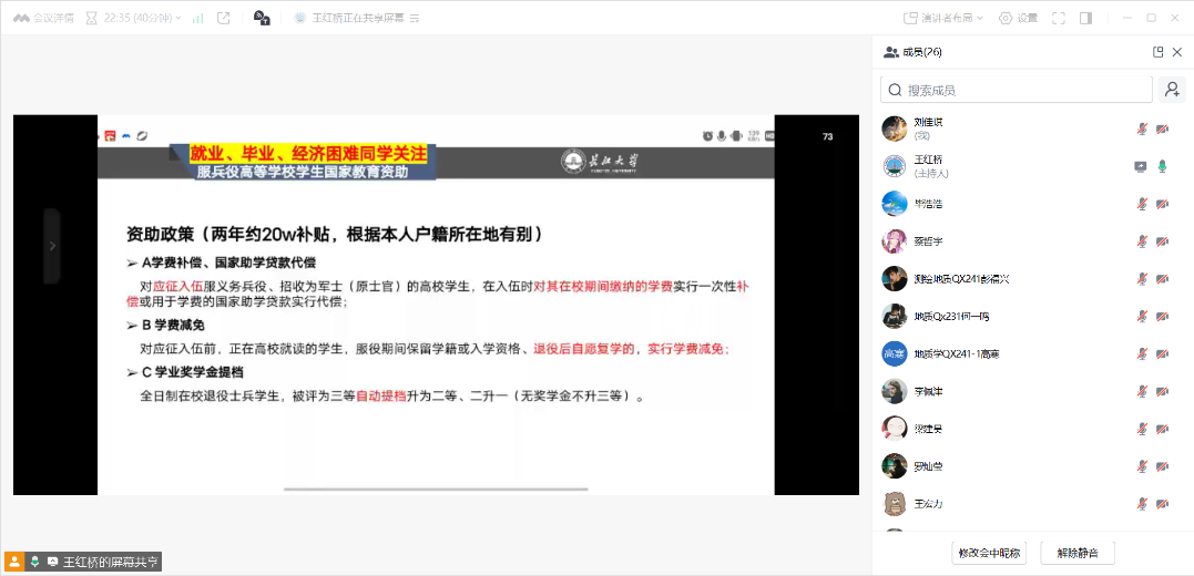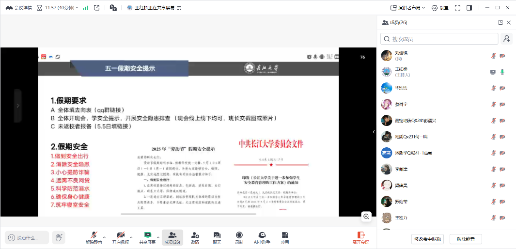 研究生安全工作会议由辅导员在线组织。辅导员介绍学校放假安排,强调落实近期学校的各项安全教育和管理工作要求。全体学生需填写假期去向表,通过线上或线下方式规范办理请销假,假期结束未返校应及时报备,假期出行期间要注意交通安全,防止溺水等。会上还通报了学院近期的安全情况,要求各班委继续落实每日定位打卡。随后辅导员介绍了国家高等学校学生服兵役政策和助学贷款政策,提醒同学们量入为出,谨防诈骗和网贷。辅导员还特别提醒班委关注班级同学的心理健康状况,发现有困难的学生要及时向学院寻求帮助。