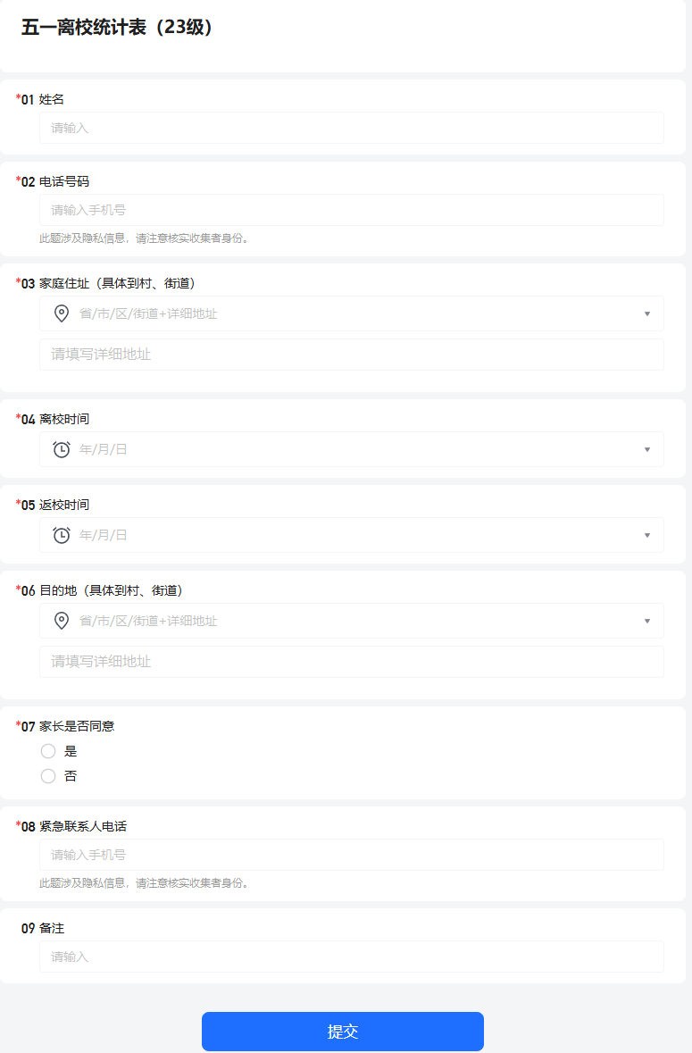 学院严格执行请销假制度,精准掌握学生行程动态,制定并公布了学工办“五一”假期值班表,全天候为同学们的安全保驾护航;每日组织全体学生通过“今日校园”APP完成定位打卡,对于临时不在校或请假同学要求填写腾讯文档收集表;同时组织全体同学填写“五一”假期离校去向表,落实安全教育管理,精准登记学生假期行程。