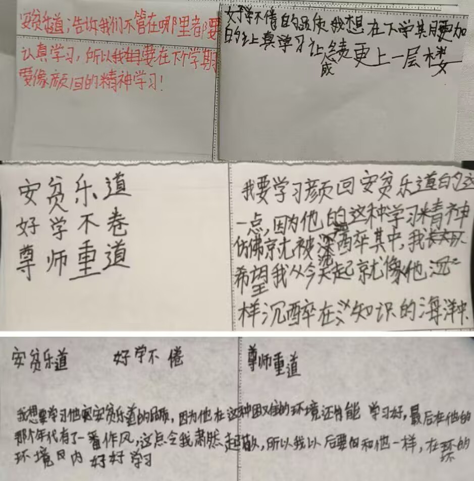 孩子们听完颜回的故事,稚嫩的脸庞上浮现出若有所思的神情。一个扎着马尾的小姑娘举起小手,坚定地说“颜回在那么苦的地方还能认真学习,我也要像他一样,好好学习天天向上。”旁边穿着黑色T恤的小男生接过话茬,说:“我以前总是学一会玩一会,静不下心来,听了颜回的故事,才知道坚持有多重要。”还有很多小朋友在笔记本上写下了他们的感悟。在互动交流中,中华优秀传统文化的种子就这样悄然播撒进孩子们纯净的心田。