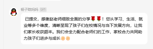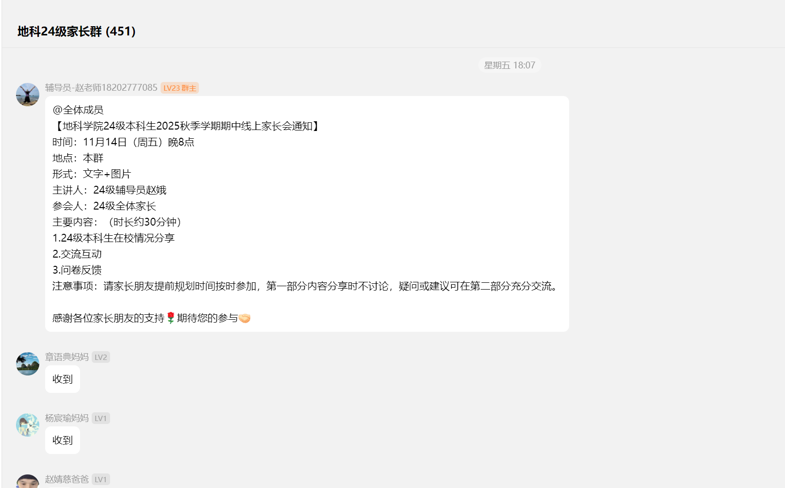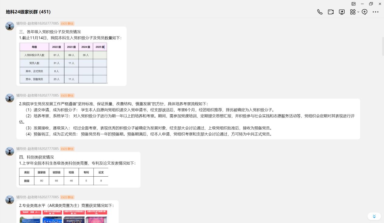 (通讯员 王彩蓓)为进一步加强家校之间的沟通与协作,构建家校共育的桥梁,共同促进学生全面成长与未来发展,11月14日晚8点,十大网投正规官网24级本科生本学期期中线上家长会顺利开展。会议由辅导员赵娥老师主讲,全体24级家长参与。 会议从家长关心的学业成绩、评奖评优、学科竞赛等方面展开,向家长们展示了学院持续强化学风建设,通过课堂考勤与学业帮扶机制关注学生成长,并呼吁家长共同督促学生重视英语四级考试与专业学习。在思想引领与成长支持方面,学院严格规范党员发展流程,并通过心理关怀、宿舍文明建设及丰富多彩的科创、心育活动为学生营造积极健康的成长环境。同时,会议结合近年考研趋势与就业形势,建议家长引导学生尽早明确生涯规划,扎实学业基础,提升综合竞争力。 交流答疑环节,家长们就英语四六级、孩子专业以后的就业方向等问题踊跃提问,赵老师就家长们关心的问题进行了耐心、细致的解答,获得了家长们的一致好评。 此次线上家长会,虽隔屏幕,却未阻隔家校心连心的交流。它不仅让家长们对孩子的在校情况有了更立体的了解,也进一步明确了家校合作发力的方向。我们坚信,唯有家校同心,携手并进,方能共同托举起孩子们更加光明、灿烂的未来! (编辑 郭霖 审核 冯舒)