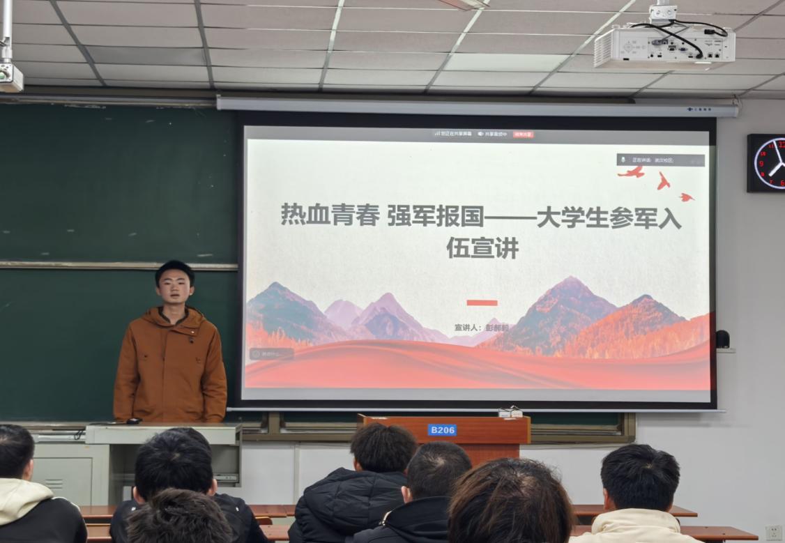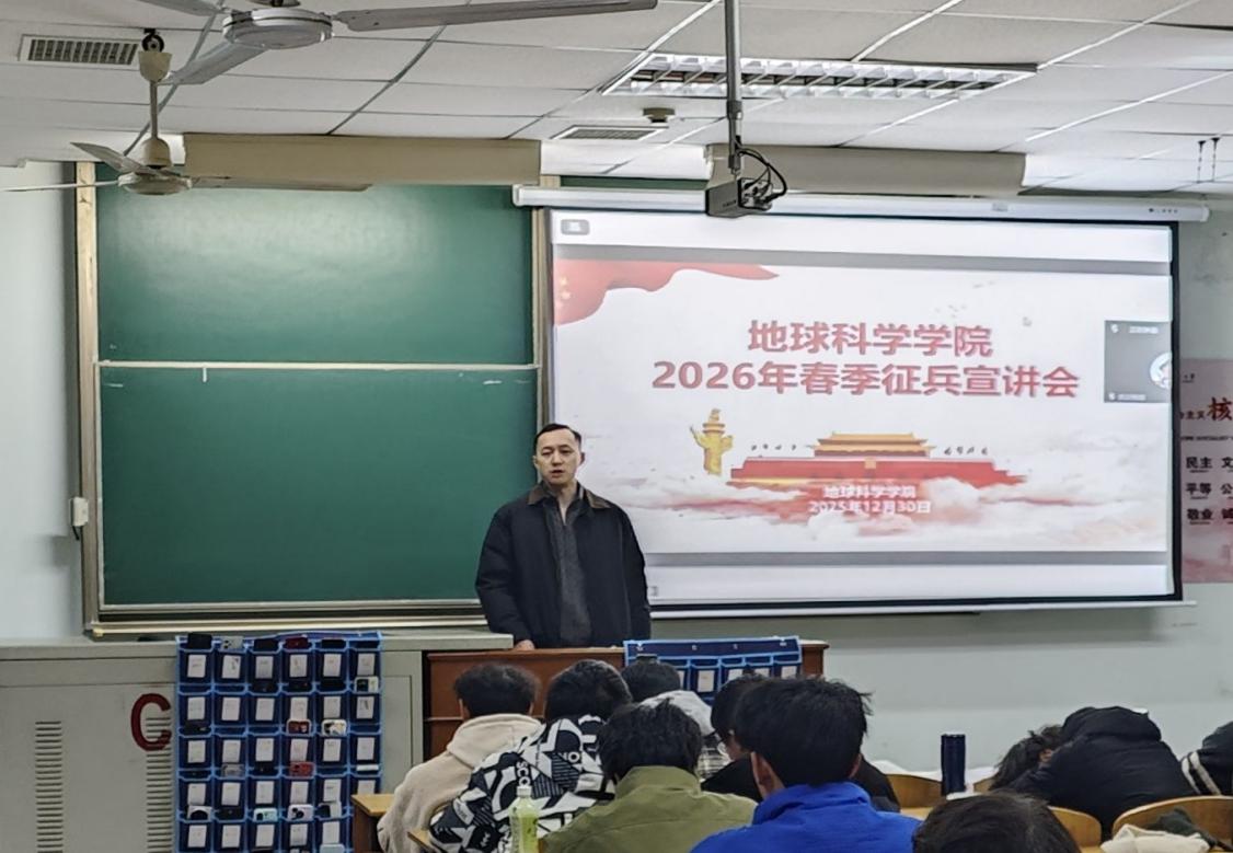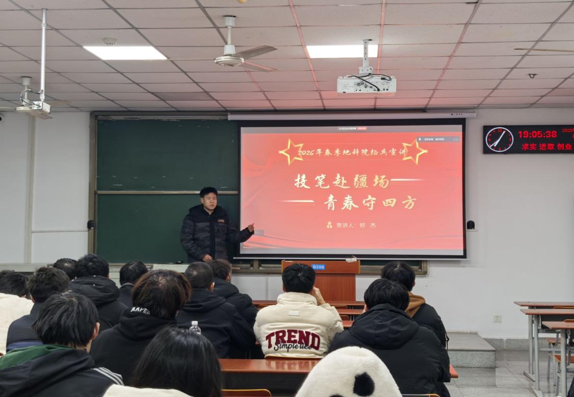 (通讯员 黄瑱 邢佰诗 李雨泽/摄)为深入贯彻落实国家征兵政策,激发在校大学生携笔从戎、报效祖国的热情。12月30日晚19:00,地科学院2026年春季征兵宣讲会在武教B206以线上线下融合方式举行。会议由退伍士兵地信22401班彭郝毅、资工22304班郑杰担任主讲,辅导员乔宇、黄瑱于武汉和荆州校区同步主持,400余名学生参与活动。