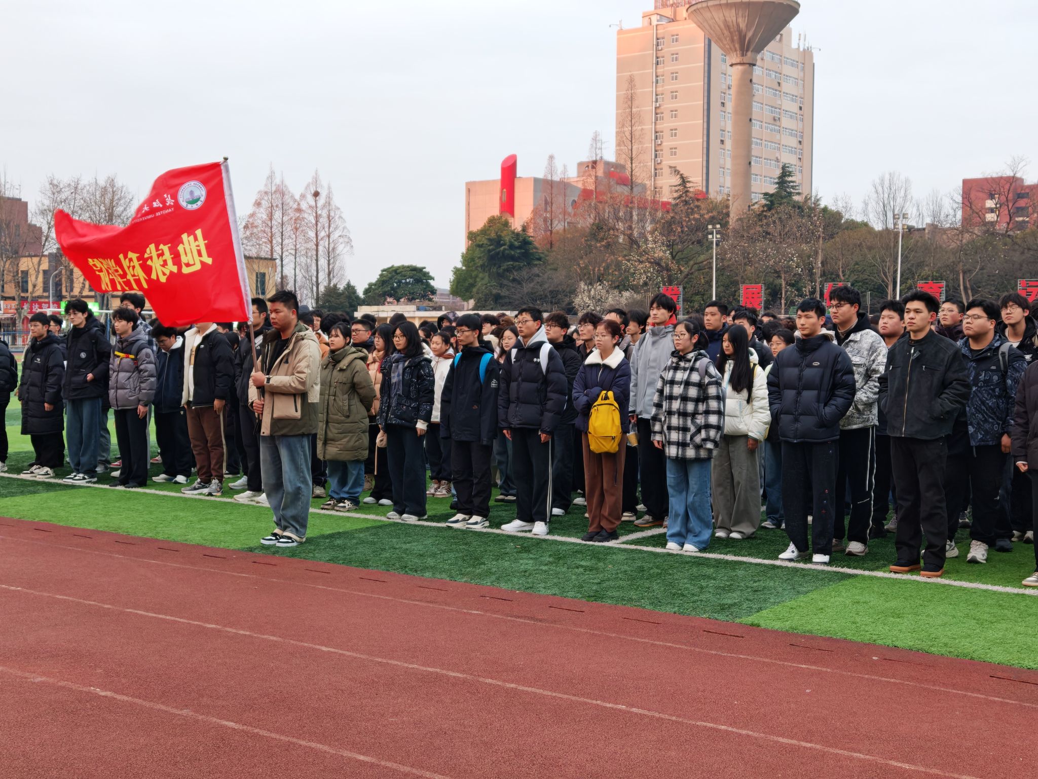 升旗仪式后,资工12504班赵俊逸作为学生代表发言,他以《做自己的掌舵人,当命运的追光者》为题,分享了自己关于大学上学期各方面的思考,号召同学们积极规划新学期的学习与生活,逐步把视野从书本转向广阔的野外,努力锻炼“地学人”真本领。